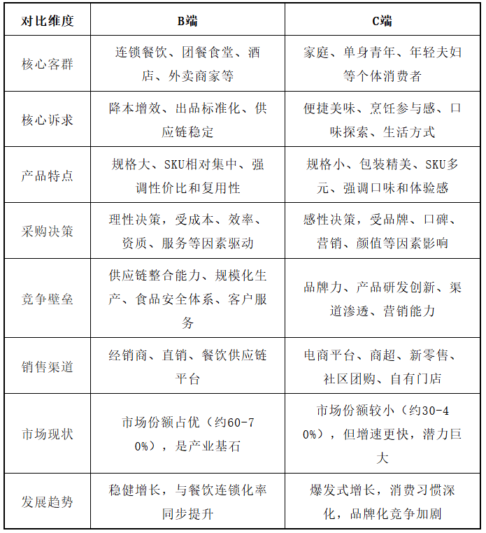B端市场焦点需求高度聚焦于“降本增效”和“尺度化”,C端市场焦点需求环绕“便利甘旨”和“糊口体例”。当前预制菜市场次要以B端发卖为从,B端市场正在全体市场布局中占领份额约为60%-70%。C端市场是预制菜行业将来最具迸发力的增加引警,近年来增速远超B端市场。